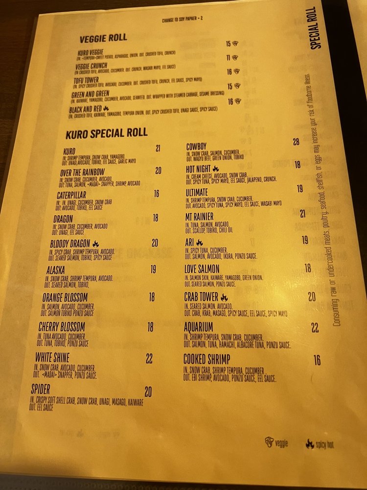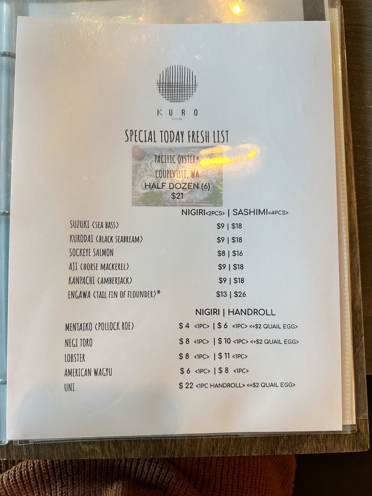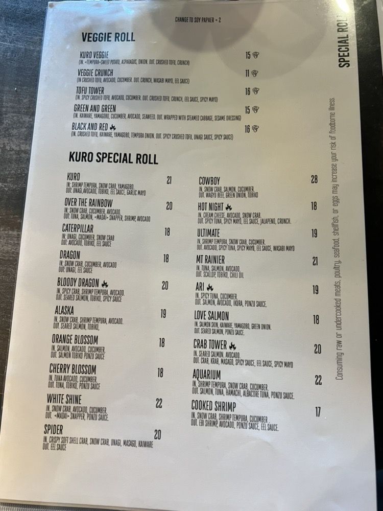 Introducing the menu at Kuro Sushi, a gem of a restaurant offering poke, Japanese cuisine, and sushi bar specialties in Bellevue, WA. With a cozy yet sophisticated ambiance, Kuro Sushi impresses with its unique use of purple rice in dishes like chicken katsu curry and veggie crunch rolls. Customers rave about the fresh fish, outstanding quality, and attentive staff. The diverse menu caters to both veggie lovers and seafood enthusiasts, with options like salmon poke bowls and saba shioyaki. Don't miss out on their Happy Hour specials and try the Chirashi for a delightful mix of flavors. Whether you're a sushi aficionado or looking to explore Japanese fusion cuisine, Kuro Sushi promises a memorable dining experience.